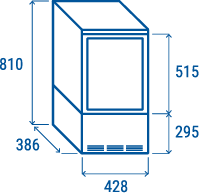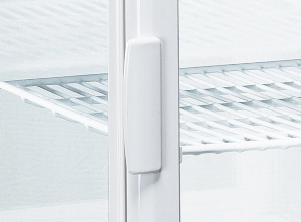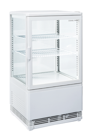 4 glass showcase equipped with flat glass, white frame and plastic base, digital temperature display control, interior LED lights 2 adjustable shelves in white.