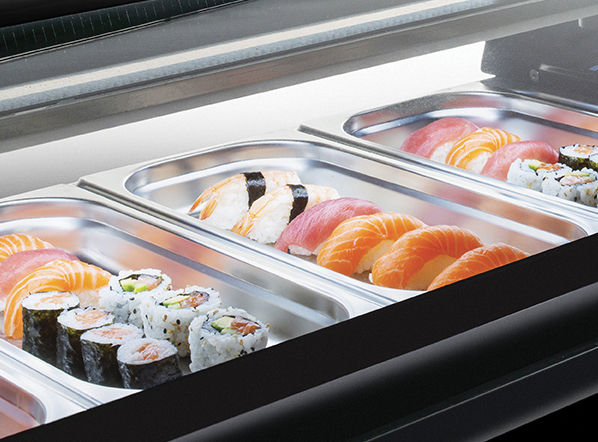 Serve-over horizontal display case (SUSHI)