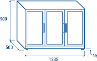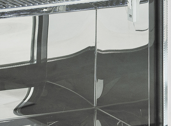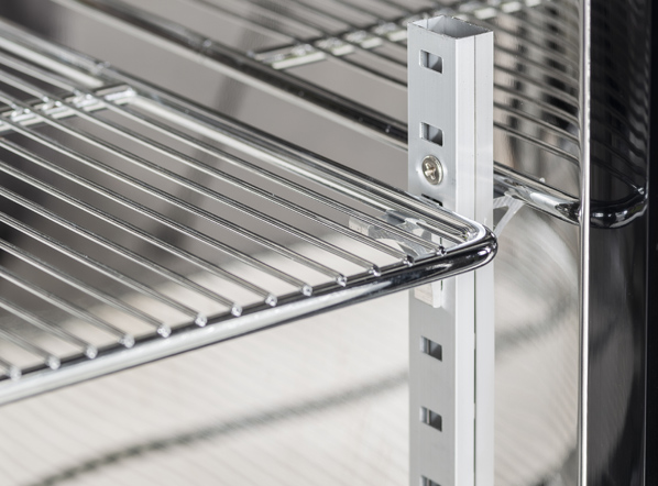 The BBA 348 model has been designed to be a modern, reliable and versatile back bar, perfect to maintain at the right temperature and to display any kind of bottles and cans. With a capacity of 302L, finished in black coated steel for the exterior and in mirror stainless steel for the inner side, this product is fitted with 3 hinged glass doors with stainless steel frame, 6 adjustable chromed shelves, self-closing door, lock, inner horizontal LED light, digital thermostat, and toughened safety tempered glass with steel frame.