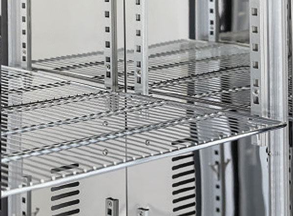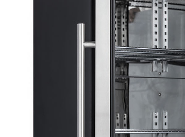The DC 728 model has been designed to be a modern, reliable and versatile drink cooler. It is ideal to display and maintain any kind of bottles and cans at the right temperature. It is also customizable with promotional messages. With a capacity of 458L, it is finished in black coated steel on the exterior and with mirror stainless-steel on the interior. This product is fitted with 2 stainless steel door frames with cylindrical handles, digital thermostat, 10 adjustable chromed shelves, an inner vertical LED light with independent switch, self-closing door and lock.