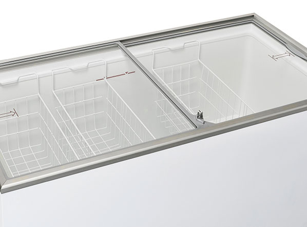Being practical, reliable and durable, this 400L chest freezer with sliding glass top, has been designed for easy storage and manage ice cream and frozen foods. Equipped with a static cooling system, double safety-tempered glass doors, and a sliding glass lids with lock and 3 baskets, the CFG 408 model is also easy to move thanks to the 4 swivel wheels.