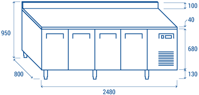 Designed to create a reliable piece of refrigeration equipment for pastries and bakeries, this product seeks to offer the perfect storage solution for both ingredients and semi-finished and finished products. The PA 4200 model is the perfect combination of efficiency, 800 mm of depth, 100 mm splash back, 4 doors, 1 adjustable shelf 600x400mm on each door, and attention to the environmental sustainability, equipped with R290 natural gas, 70 mm insulation foaming on each side, doors with internal embossing for better sealing and a self-closing door to avoid energy waste.