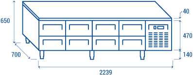Designed to create a comfortable and efficient work station, that allows to storage fresh food in the refrigerated zone at the bottom and cook it with free-standing equipment on the top. The U-GN 4180 model is the perfect combination of efficiency and modularity in a professional kitchen with 650 mm height, 8 sliding drawers GN1/1 suitable for pans 100mm depth, digital thermostat and height-adjustable feet (from 120mm to 180mm).