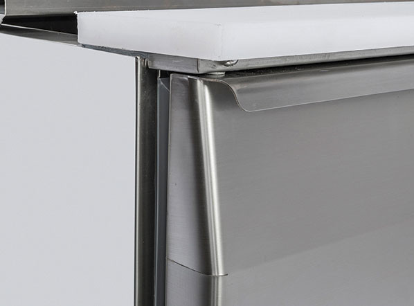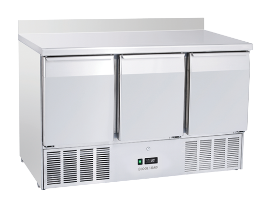 Clean and essential appearance, this model with stainless steel top, it’s perfect to save space and offer a refrigerated workstation in any professional kitchen. The CRA 93A is a perfect example of adaptability with three doors, an adjustable shelf GN1/1 for each door, a 100 mm splash back, a digital thermostat, an engine room at the bottom, an easily removable condenser filter for smooth maintenance and cleaning and a sliding engine which is easy to pull out for manageable after-sales servicing.