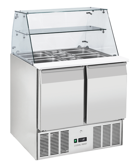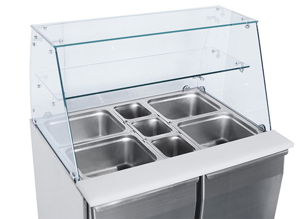 Clean and essential appearance, this model with open top and glass protection is perfect to save space and offer a refrigerated workstation in any professional kitchen. The CRQ 90A is a perfect example of efficiency, two doors, an adjustable shelf GN1/1 for each door, a digital thermostat, an engine room at the bottom, an easily removable condenser filter for smooth maintenance and cleaning and a sliding engine which is easy to pull out for manageable after-sales servicing.