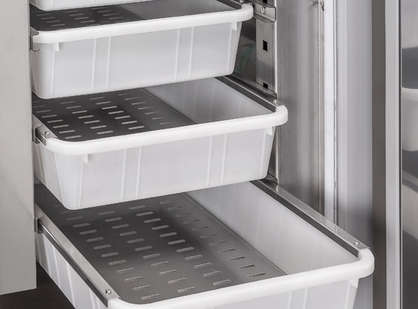 With a clean design, this product has been developed for fresh fish refrigeration. It comes finished in stainless steel, with its engine located at the bottom side to provide a more comfortable goods storage-system and a digital controller. The QRX 688FH model is a perfect combination of technological improvements and manufacturing experience, with foamed door handle, self-closing door, open-door and high-temperature alarm to avoid energy waste, 8 pans “fish water drain tray” antioxidation included, static cooling system, eco-friendly gas R290 and 80mm insulation foam on each side to ensure optimum energy-saving. To complete the high-end features list, it comes with removable filter, internal vertical LED lights and lock fitted as standard; as well as reversible door and height-adjustable feet on demand.