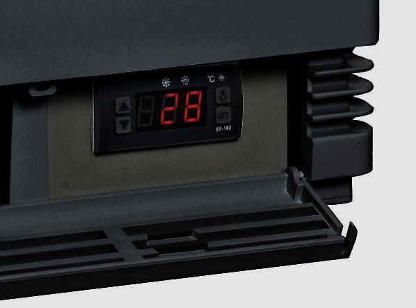 Vetrina refrigerata di colore nero con vetro dritto, equipaggiata con display digitale per il controllo della temperatura, luci interne a LED e 4 ripiani regolabili di colore nero.
