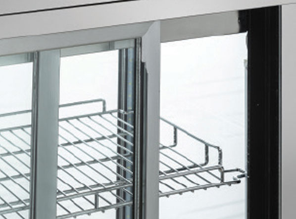 luci LED, doppio vetro anti condensa, sportelli posteriori scorrevoli e ripiani regolabili cromati.