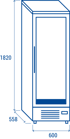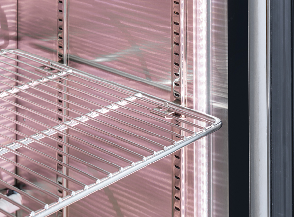 Con una capacità di 293 litri, rifinito in acciaio inox all’esterno e con acciaio inossidabile a specchio all’interno, questo prodotto è equipaggiato con porta a vetro con telaio in acciaio inox e maniglia cilindrica verticale, display digitale, 3 ripiani cromati regolabili, doppia luce LED verticale interna (colore rosa), porta autochiudente e serratura di serie.