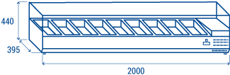 Con una larghezza di 2000mm, la VRX 20/38 è predisposta per contenere 9 vaschette GN1/3 (non incluse), ed è accessoriata con termostato digitale e piedini regolabili. Sono disponibili come optional piedini alti in acciaio inossidabile (140-210 mm).
