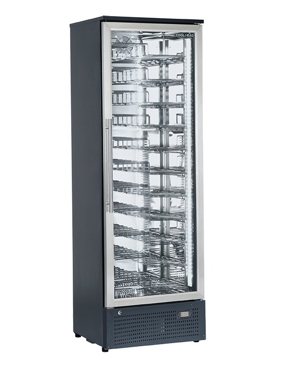 Questa cantinetta professionale è equipaggiata con 8 ripiani in legno, display digitale e luce interna LED di colore blu, porta reversibile con maniglia cilindrica verticale, serratura, vetro scuro per la protezione del vino e allarme apertura porta.